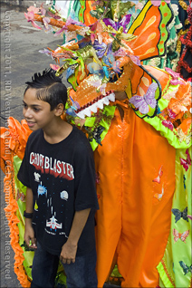 The ‘Travel Channel’ was there collecting video of everything. I’m sure they will get around to featuring the Ponce Carnaval on TV. I’m the guy in jeans with the camera on a stick and camo hat. They were busy shooting the construction of the sand sculpture, being created off a corner of the Plaza that spilled into the street. They were still working on it when I showed up. The sculpture will be a key feature in the ‘Burying of the Sardine’ on Tuesday night.