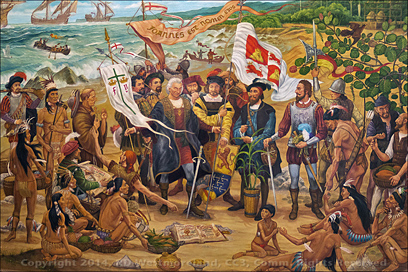 ornately decorated elevators. At ground level, the rotunda features a central display of Puerto Rico’s Constitution, the original papers. All behind glass. Also located on the main floor, mounted to the 4 outside walls are 12 high relief white marble panels displaying the history of PR from the 15th to 20th Century.