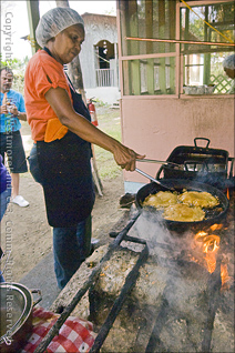 We collected ourselves up and then headed out to get something to eat. The original plan was to stop at Casa de los Pastelillos. But it was packed for a Sunday with a line out the door of folks waiting to get in.  El Fogon De Suza of Jobos Frying Bacalaito on Open Hearth in Puerto RicoWe ended up stopping at one of the smaller road side shacks and scored some freshly fried goodness.