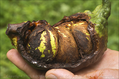 Moving on from there, Bryan pointed out several mature Kola Nut trees (Cola acuminata). A few still had seed pods hanging from them, but the rats were busy working over the shells. Not the seeds, however.