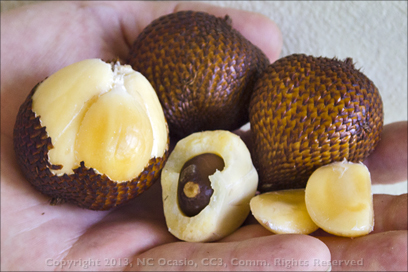 Up the path further was a collection of Salak Palms. This was a special treat for me as I have 9 Salak palm sprouts doing quite well. It was the first time I had seen them up close and personal. And these had fruits too!!! The thin scaly, paper like outside shell is easy to remove revealing a group of 3 to 5 fruit sections that resemble giant garlic cloves.