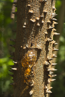 The trees were densely covered in spike like thorns and resin, even the young trees exuded an abundance of clear, amber colored sap. At a distance, the tree resembles a type of thorny Mimosa.