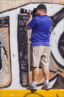 After that, the photo group took a stroll down the outside of the park before crossing the street in search of old ruins and graffiti. The broad sidewalk/walkway featured colorful mosaics of flowers, palms and trees. This was an older park, but well cared for. Cleanup crews and cops were everywhere.