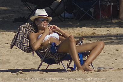 We started at the Surf Lookout featured in the pano shot. The view from there is strictly long telephoto. The surfers have to paddle out past the rocky shore to surf so they never make it in very close. The small public beach (with public facilities) to the right of the surfers was crowded with locals out working on their tans or playing in the water. Looked like fun to me.