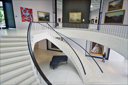 This structure was originally designed by architect Edward Durell Stone, it features several hexagonal galleries with natural light streaming in from above.
