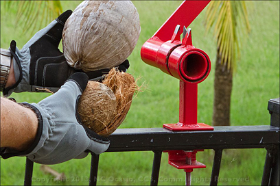 I scored a nifty tool for removing the husk from Coconuts. I nick-named it the ‘Husk Buster’… works real good too. Mine is for ‘lefties’. If you have ever tried to cut off the outside husk, you know what a pain it is. It was made by hand in Hawaii and they come in several colors. Here’s a link to the guy’s Website. I’ll be recycling the shredded husk for growing media.